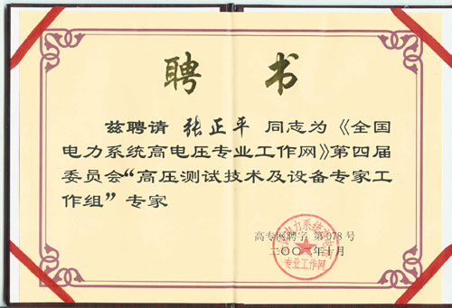 我公司總經(jīng)理張正平被全國(guó)電力系統(tǒng)高電壓專業(yè)工作網(wǎng)聘為工作組專家