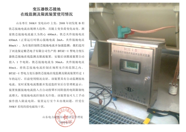 山東省棗莊500KV變電站安裝運(yùn)行變壓器鐵芯接地在線監(jiān)測(cè)及限流裝置